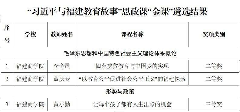 根据《中共福建省教育工委关于公布“习近平与福建教育故事”思政课“金课”遴选结果 暨教学展示活动的通知》(闽委教思〔2023〕14 号)文件精神,英国365官方网站喜获二等奖2项,三等奖1项,具体如下: