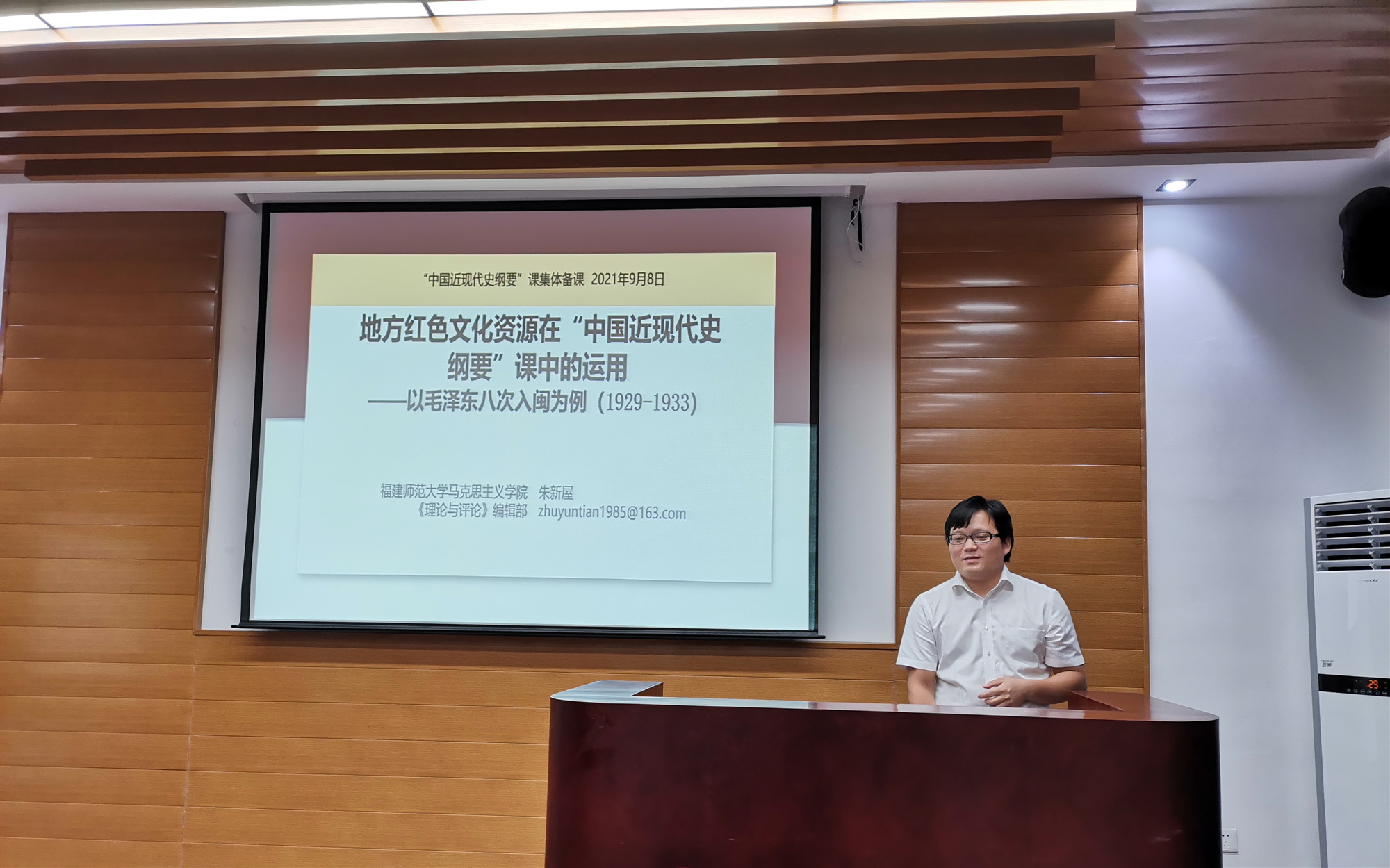 9月8日下午,党史学习教育省委宣讲团成员、福建师范大学朱新屋副教授应邀到我校作题为“地方红色文化资源在‘中国近现代史纲要’课中的运用——以毛泽东八次入闽为例(1929-1933)”的示范教学。校党委副书记吴访益和英国上市公司365教师参加学习。